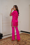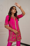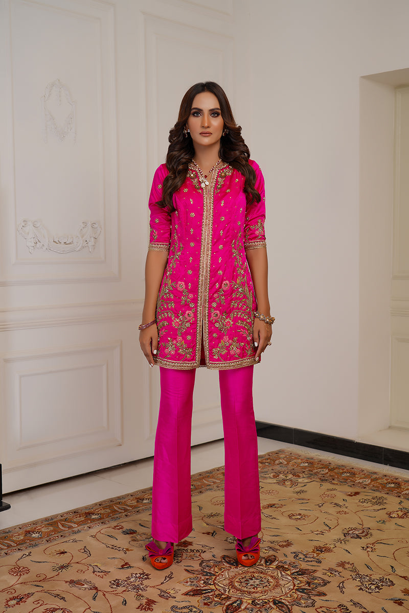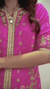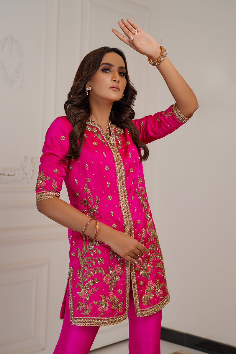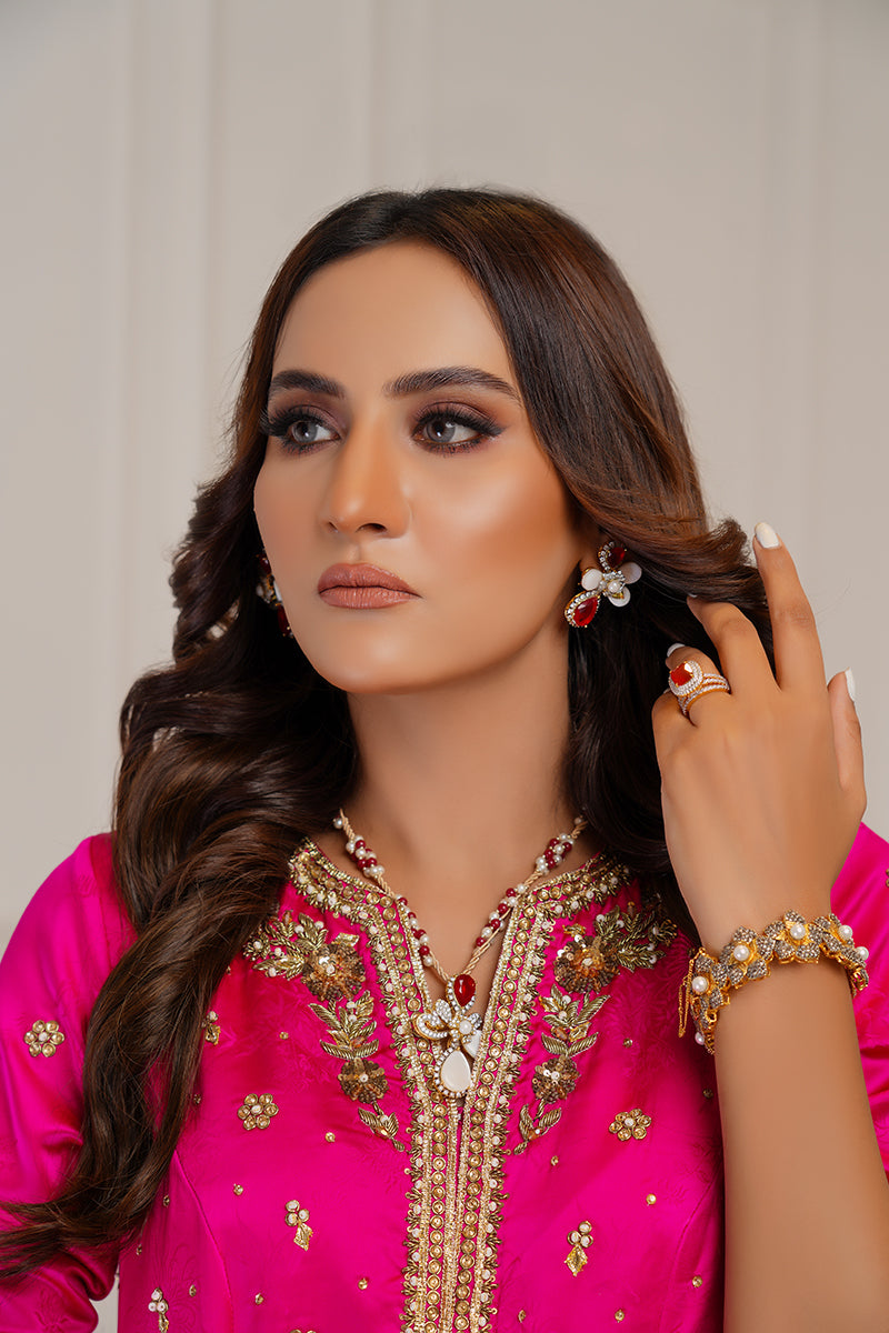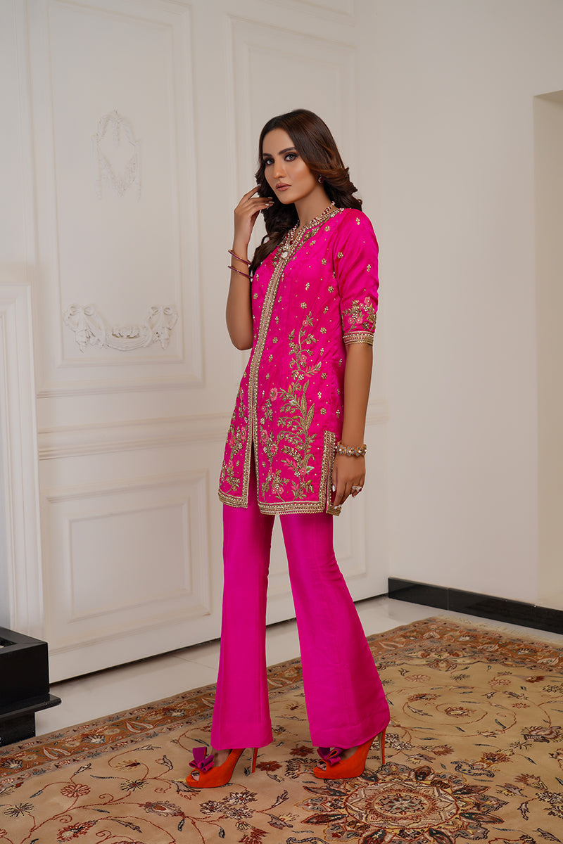 A bright pink outfit seamlessly mingled with the undeniable charm of dramatic details. Hand embellished heavy formal featuring a perfect amalgamation of our rich heritage. Front embellished motifs on Silk and comes with beautiful work on sleeves and borders.