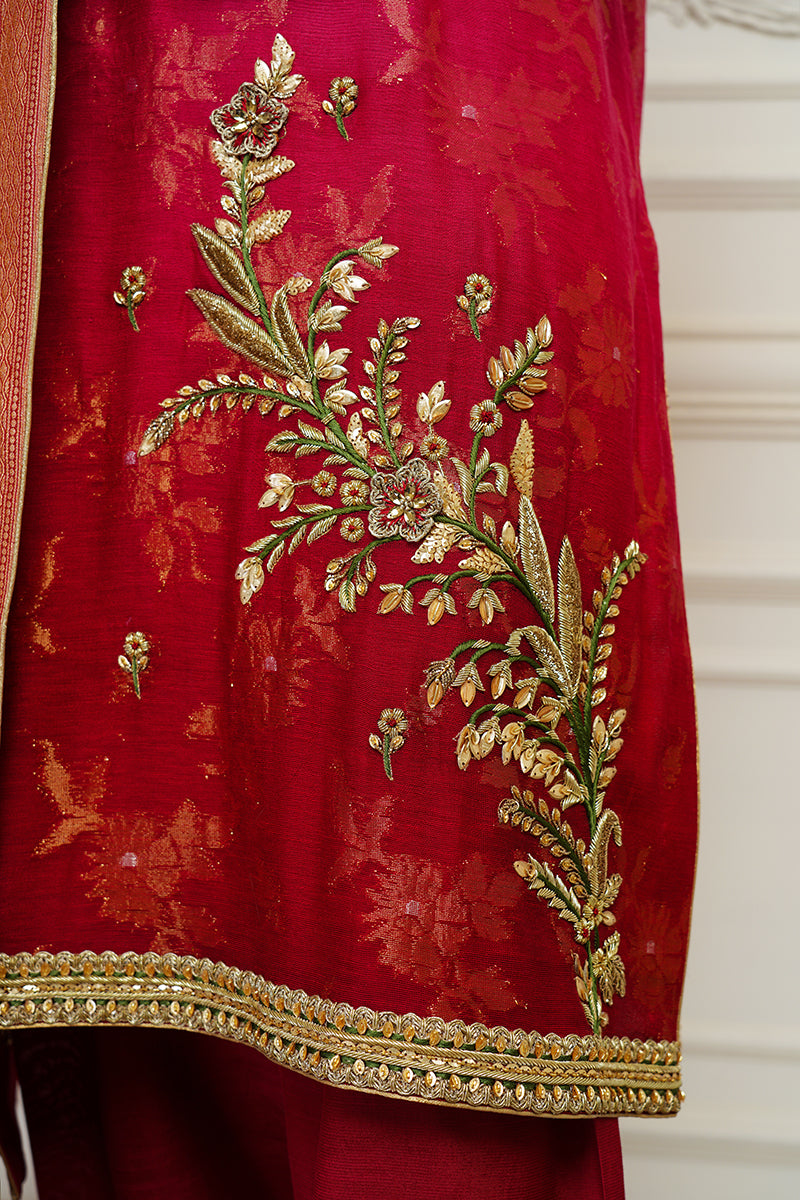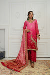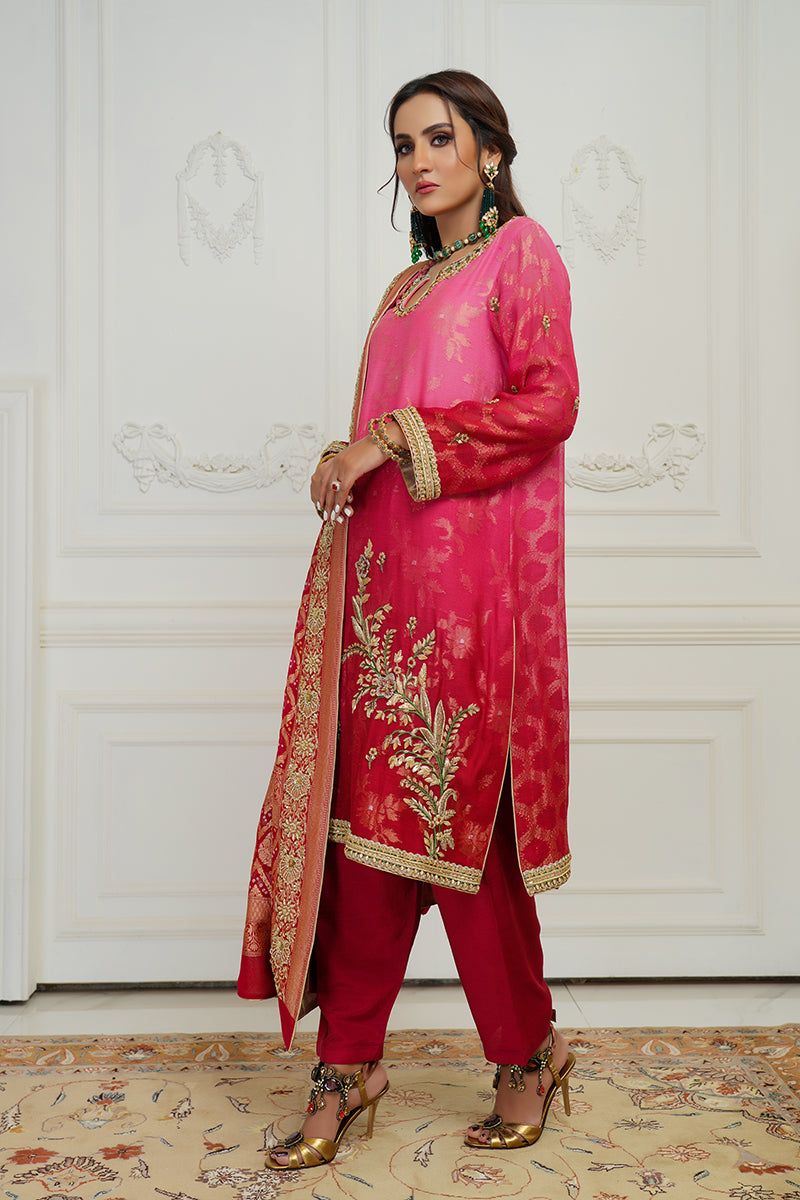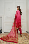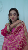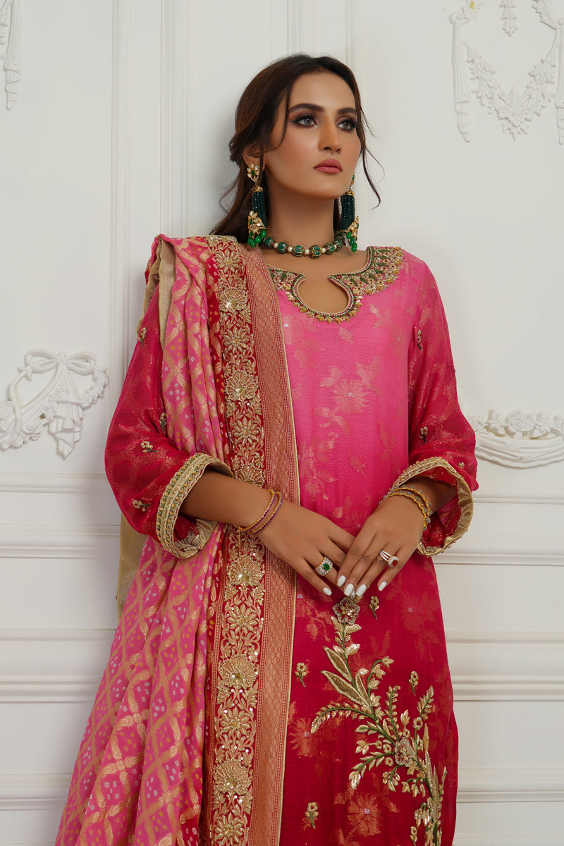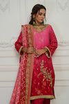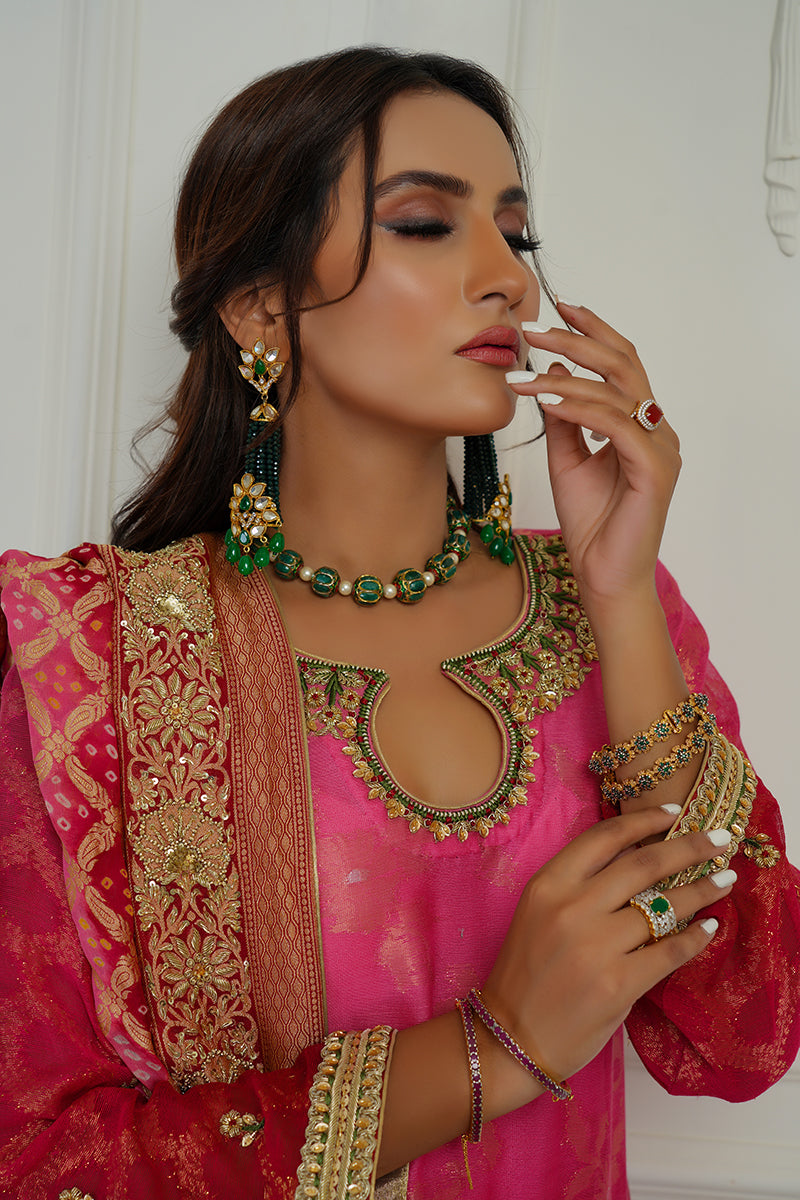 Effortlessly crafted outfit crusted with exceptional embroidery all over the dress. A bright pink jeweled couture piece on a cotton zari net ready to dazzle your wardrobe. Comes with hand worked Chunri Dupatta.