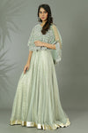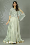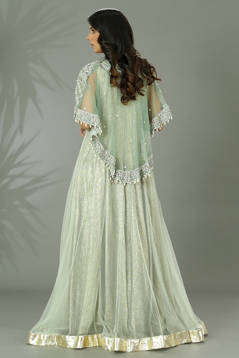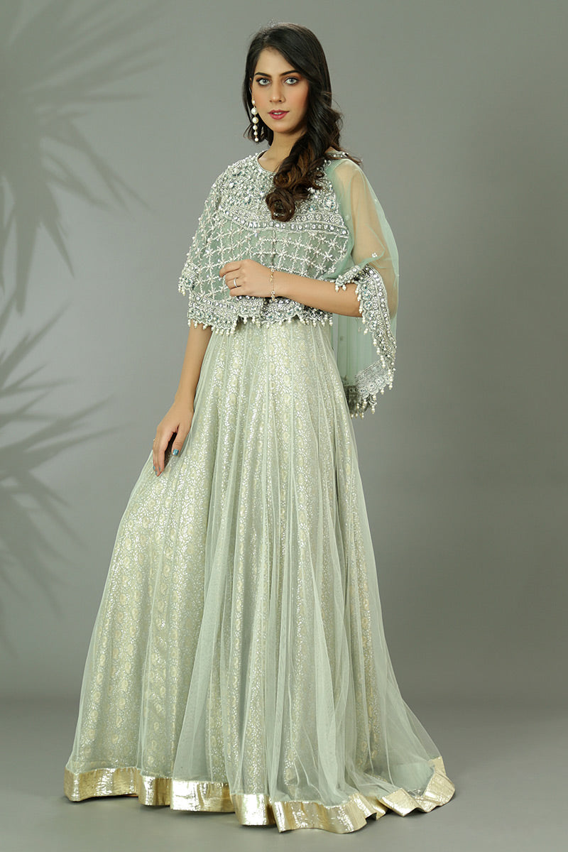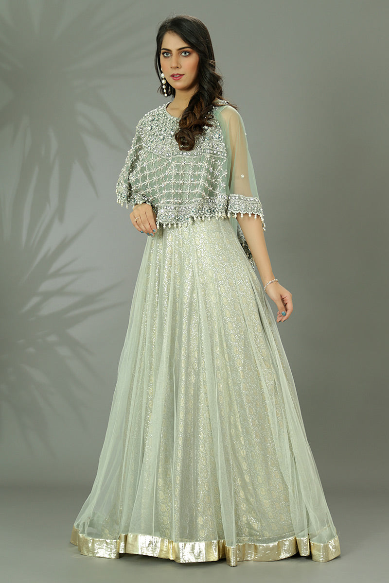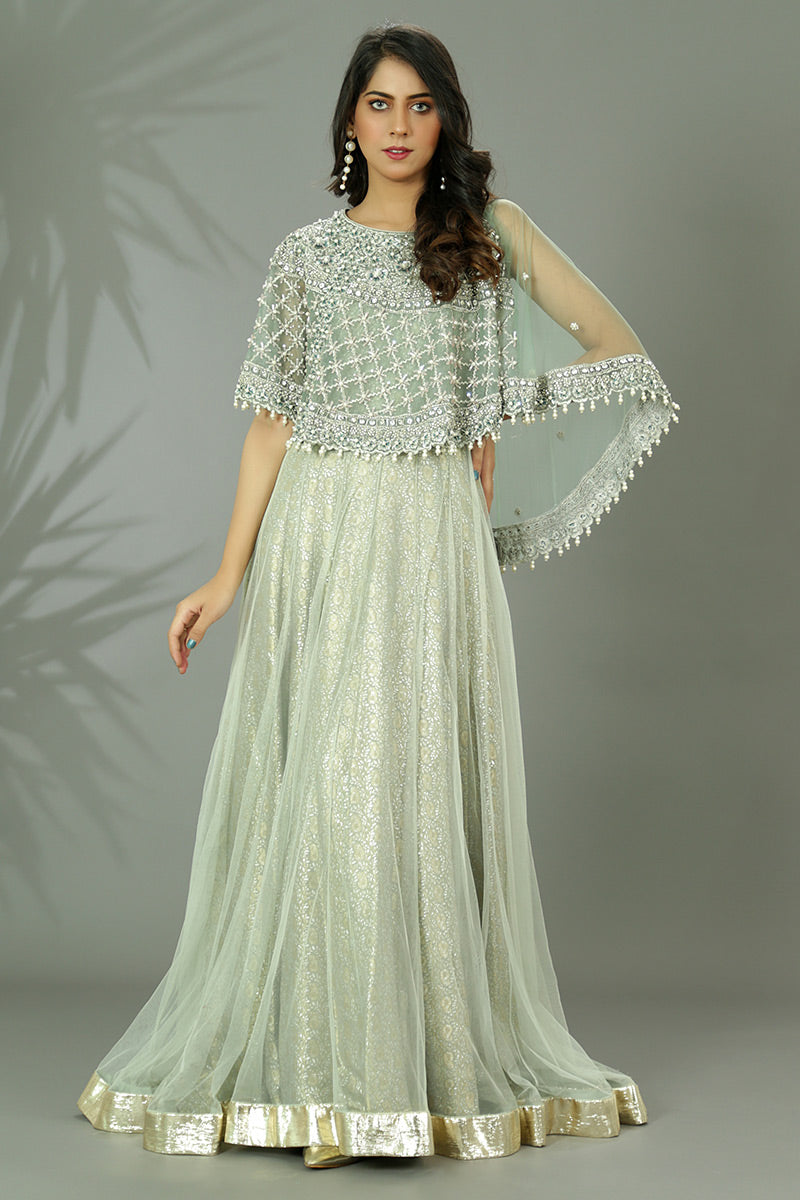 A cape designed with shimmering silver embellishments and thread work in the shades of silver and aqua with gorgeous, laborious details. Teamed with a long net and banarsi gown.