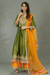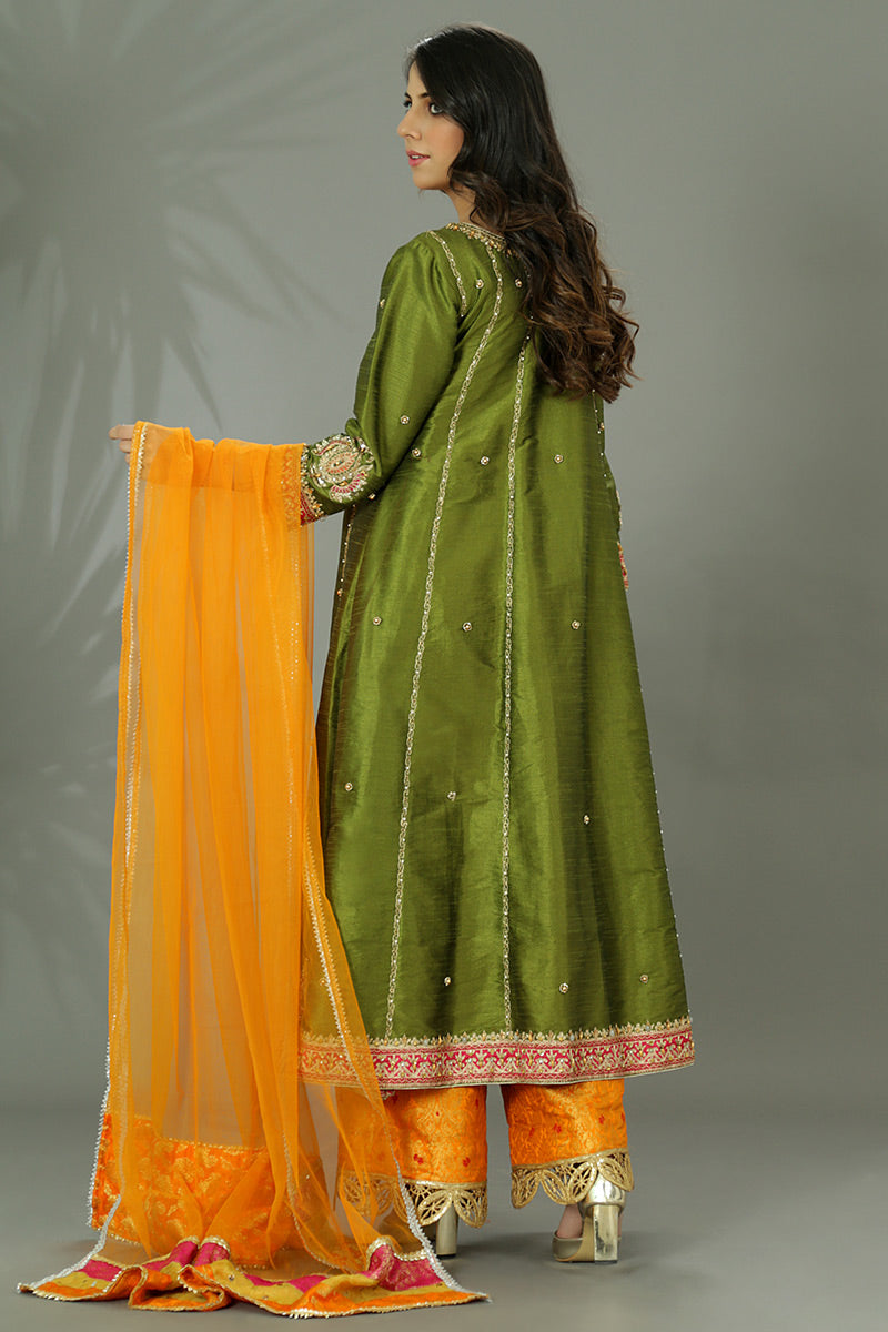 A dazzling garden of threads, with brilliantly blooming flowers of shinning Sequences and thread. A long kali Frock with banarsi pants and net Dupatta.