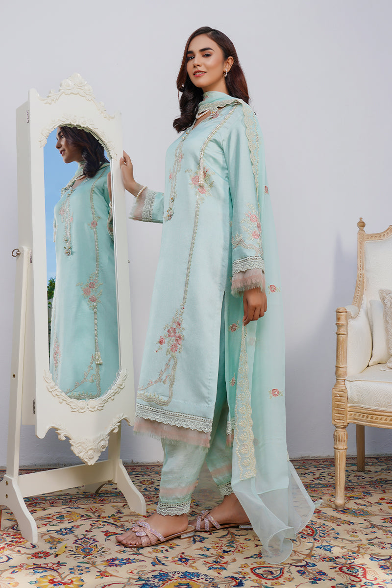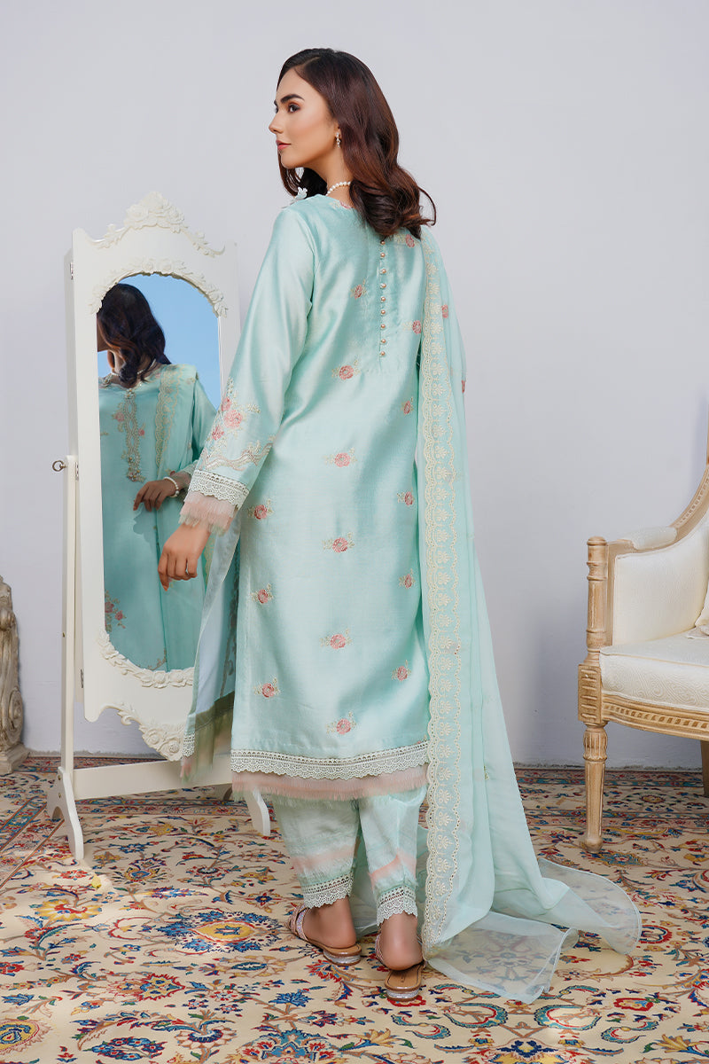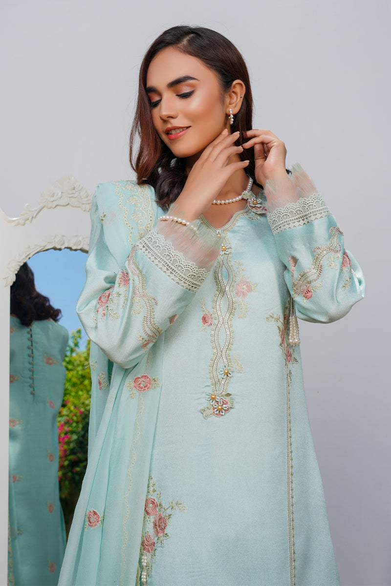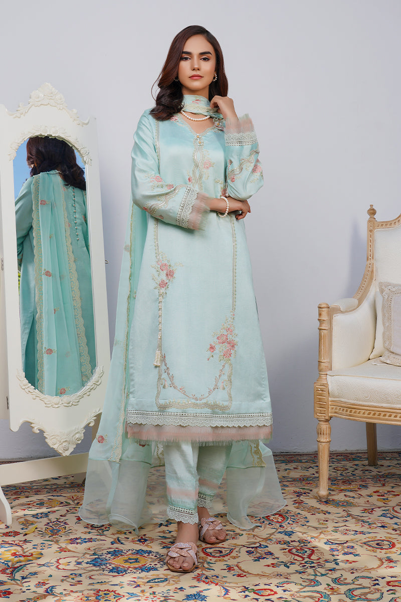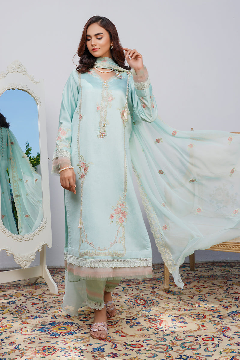 This stunning ensemble consisting of a cotton net shirt, korean raw silk pants, and a chiffon dupatta. The shirt is crafted with delicate cotton net fabric, offering a lightweight and breathable feel while exuding an elegant charm. The korean raw silk pants add a touch of sophistication with their smooth texture and tailored fit. To complete the ensemble, the chiffon dupatta drapes gracefully, adding a layer of grace and femininity.