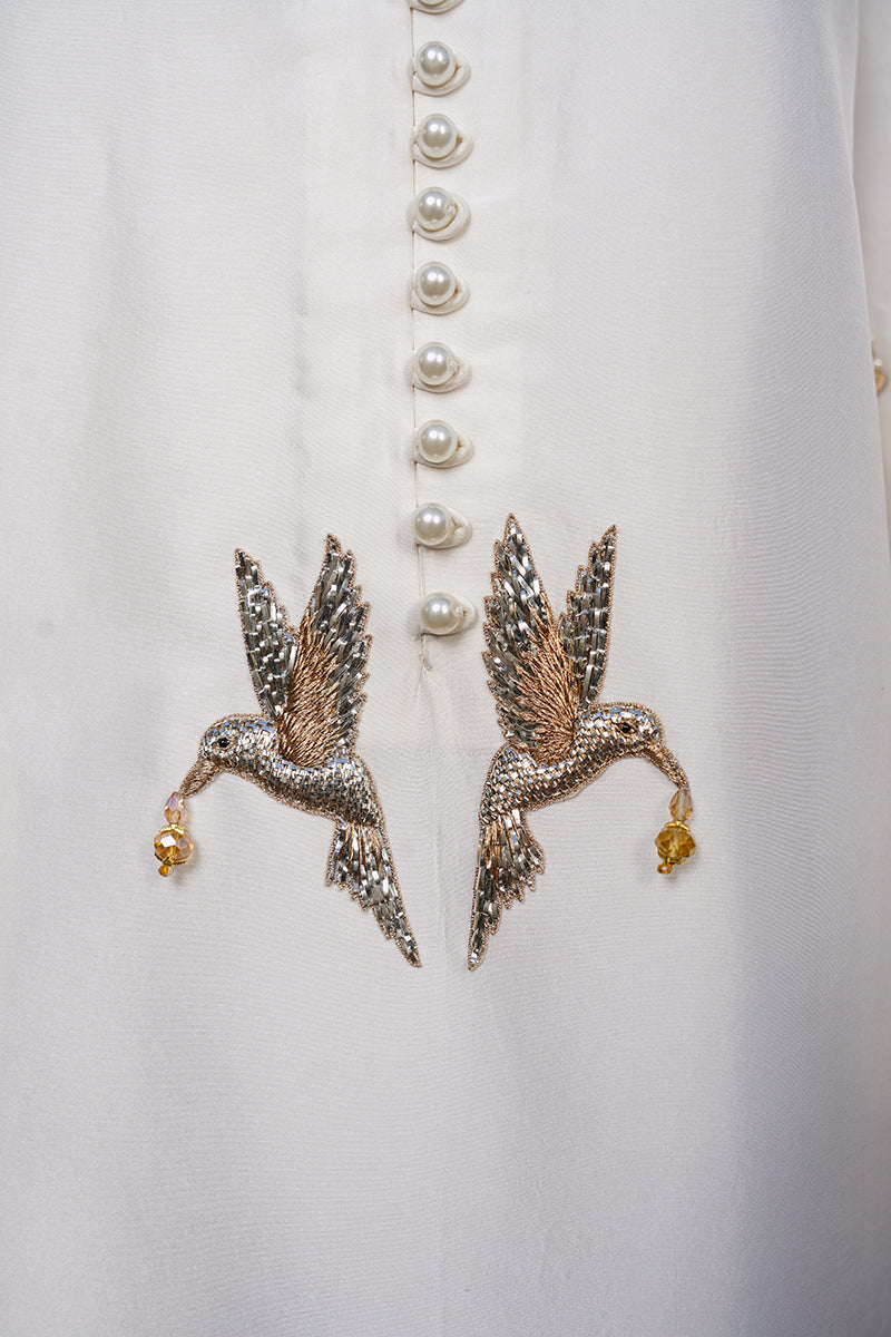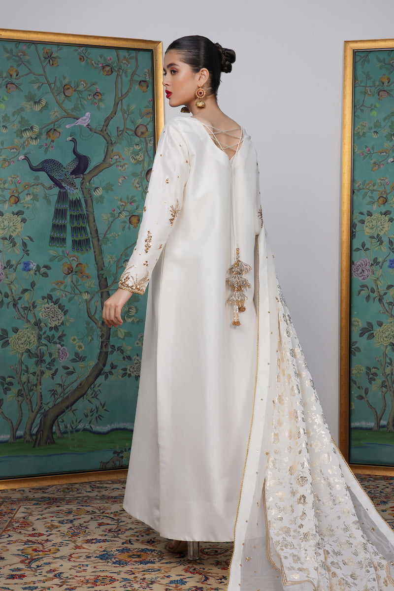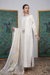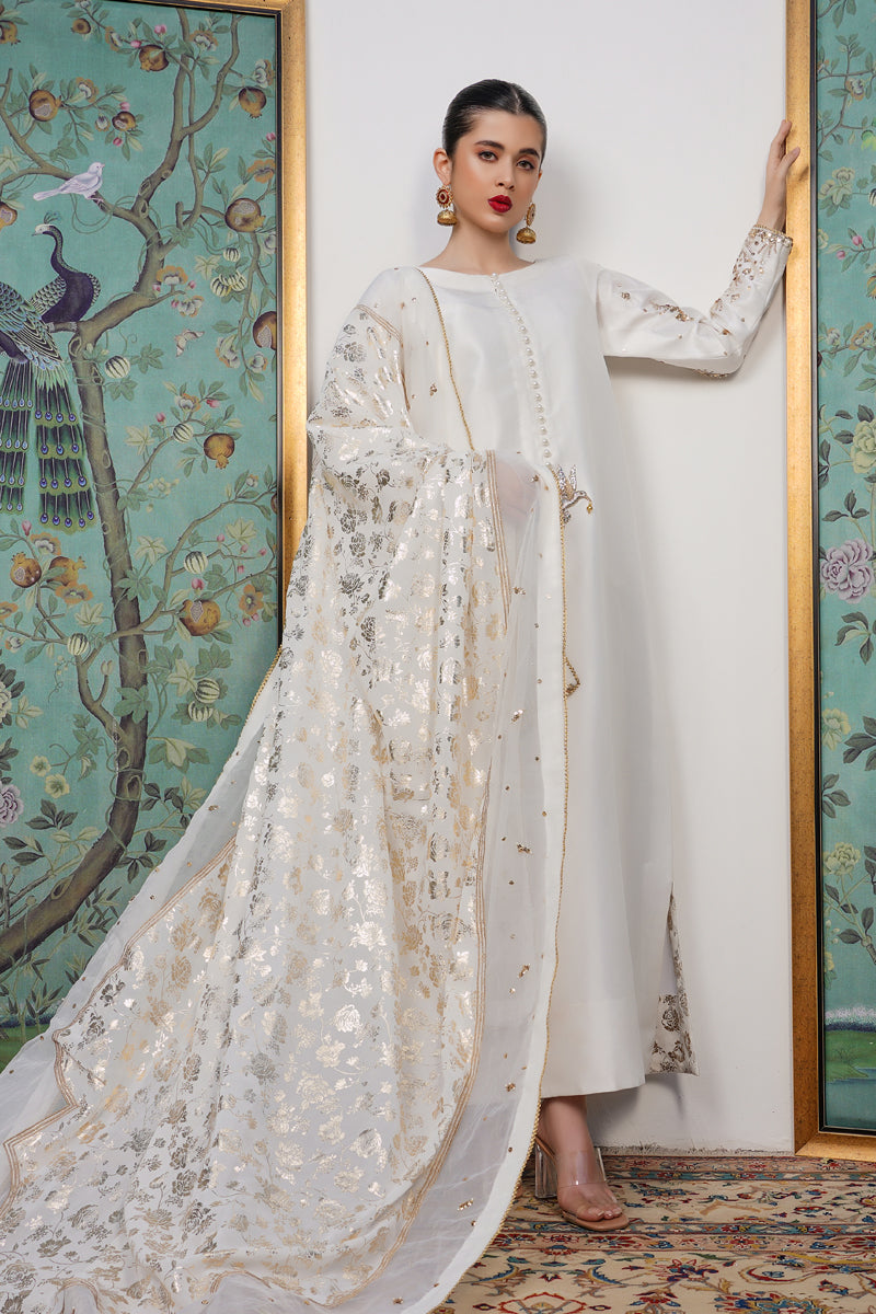 Indulge in the luxurious charm of our ensemble crafted from pure raw silk. The shirt and pants are meticulously tailored with this exquisite fabric, ensuring a smooth and elegant drape. Accompanying the ensemble is a stunning dupatta, featuring a captivating foil print on chiffon georgette, beautifully mixed with organza borders.