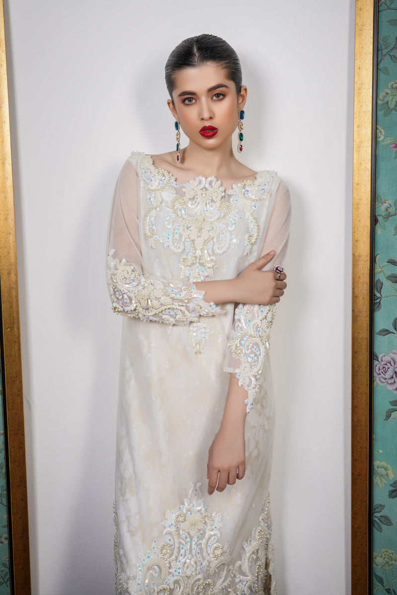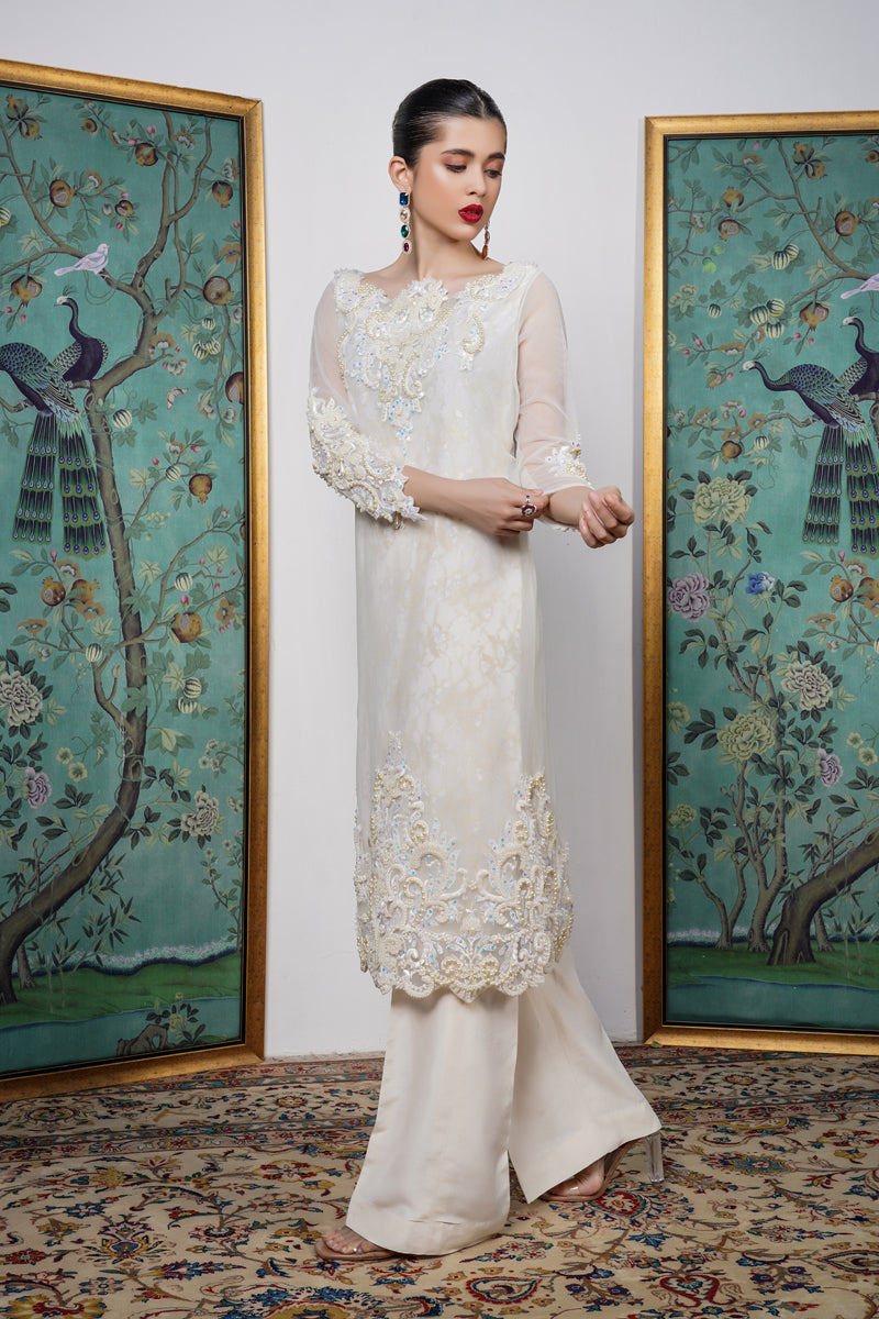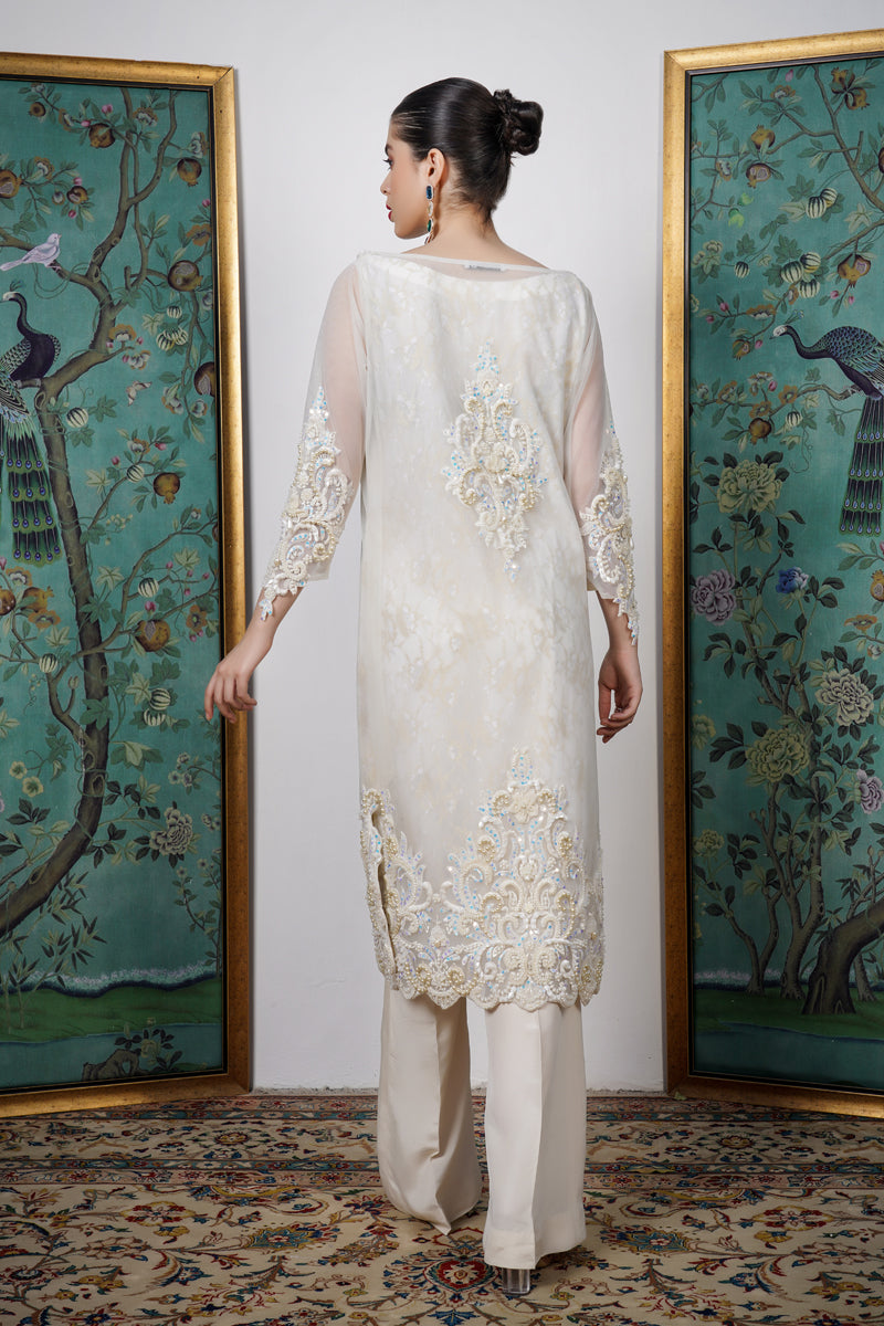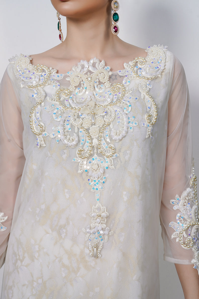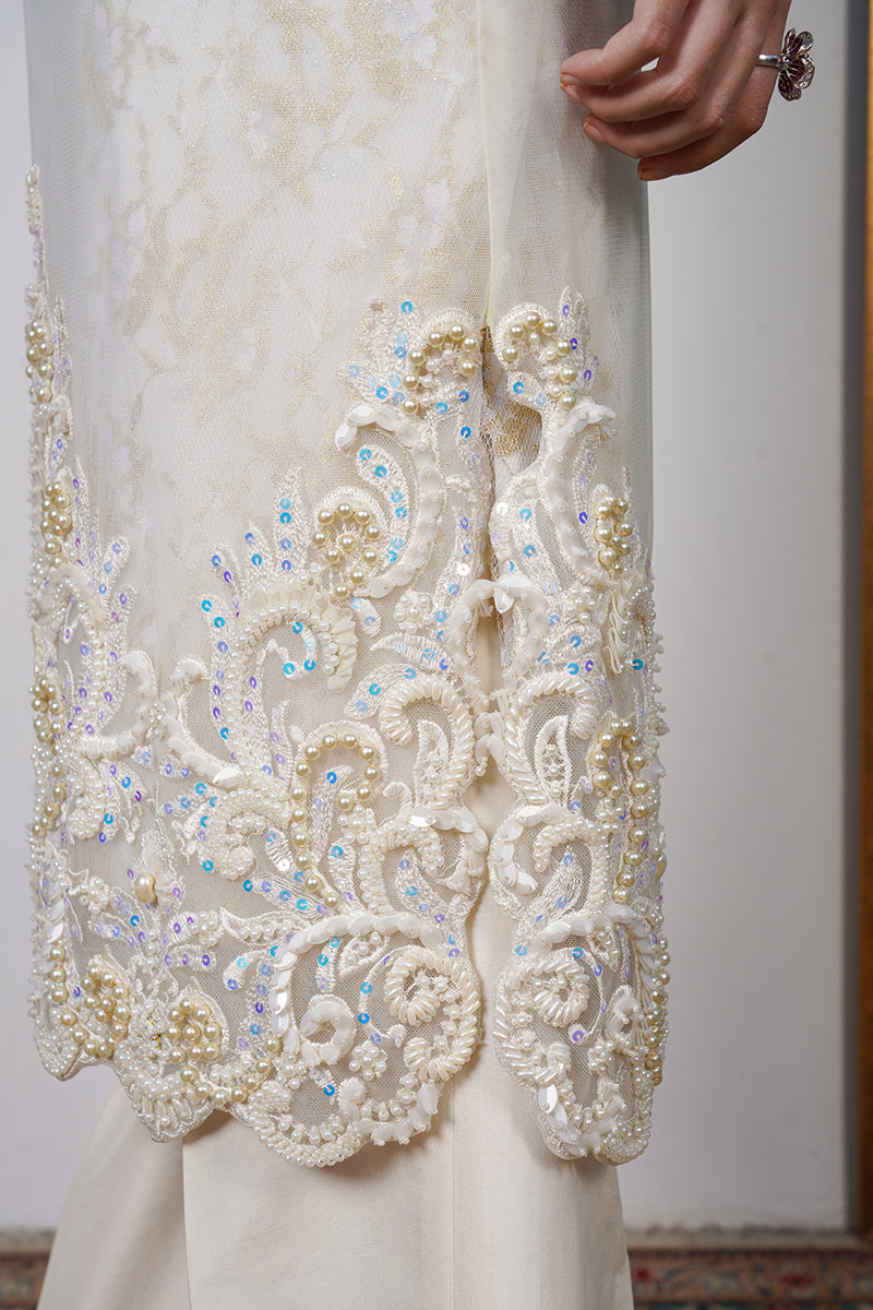 This ensemble features a combination of net and lace fabric, creating a delicate and elegant look. The pants are made of raw silk, providing a contrasting texture to the overall outfit. The work done on this ensemble includes Rashim thread embroidery and the addition of pearls, adding a touch of sophistication and intricacy. The outfit is further enhanced with special sataras, which are decorative motifs or patterns, adding a unique and eye-catching element to the design. Overall, this outfit exudes a graceful and feminine charm.