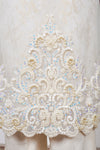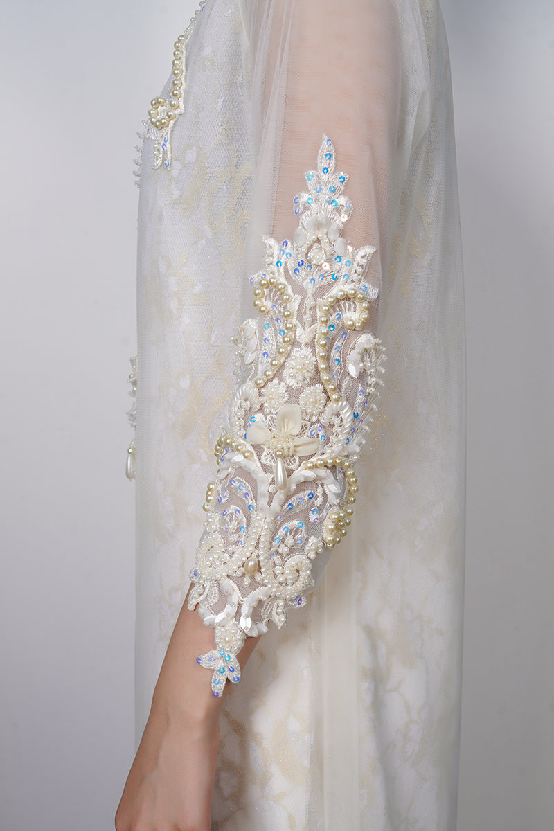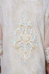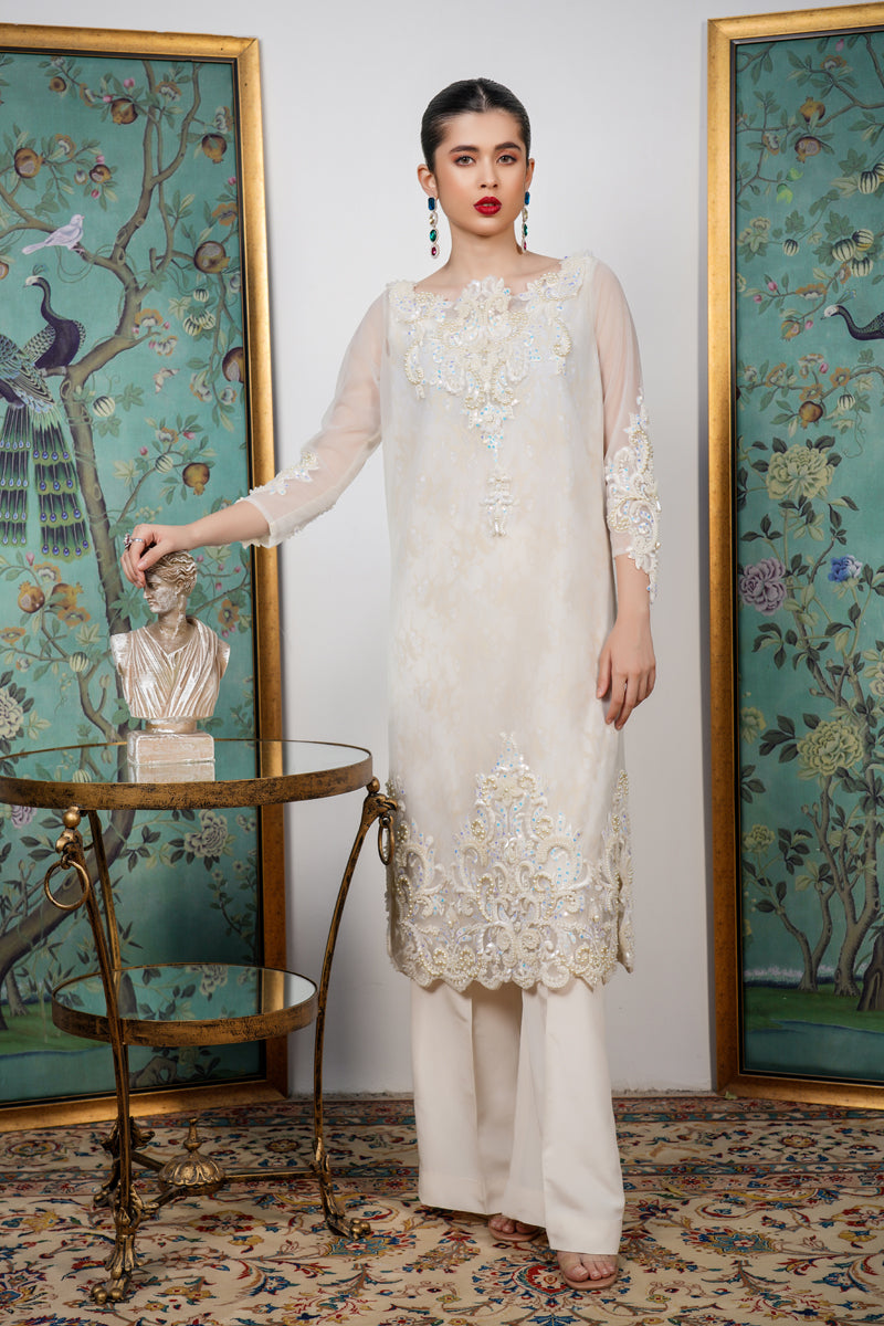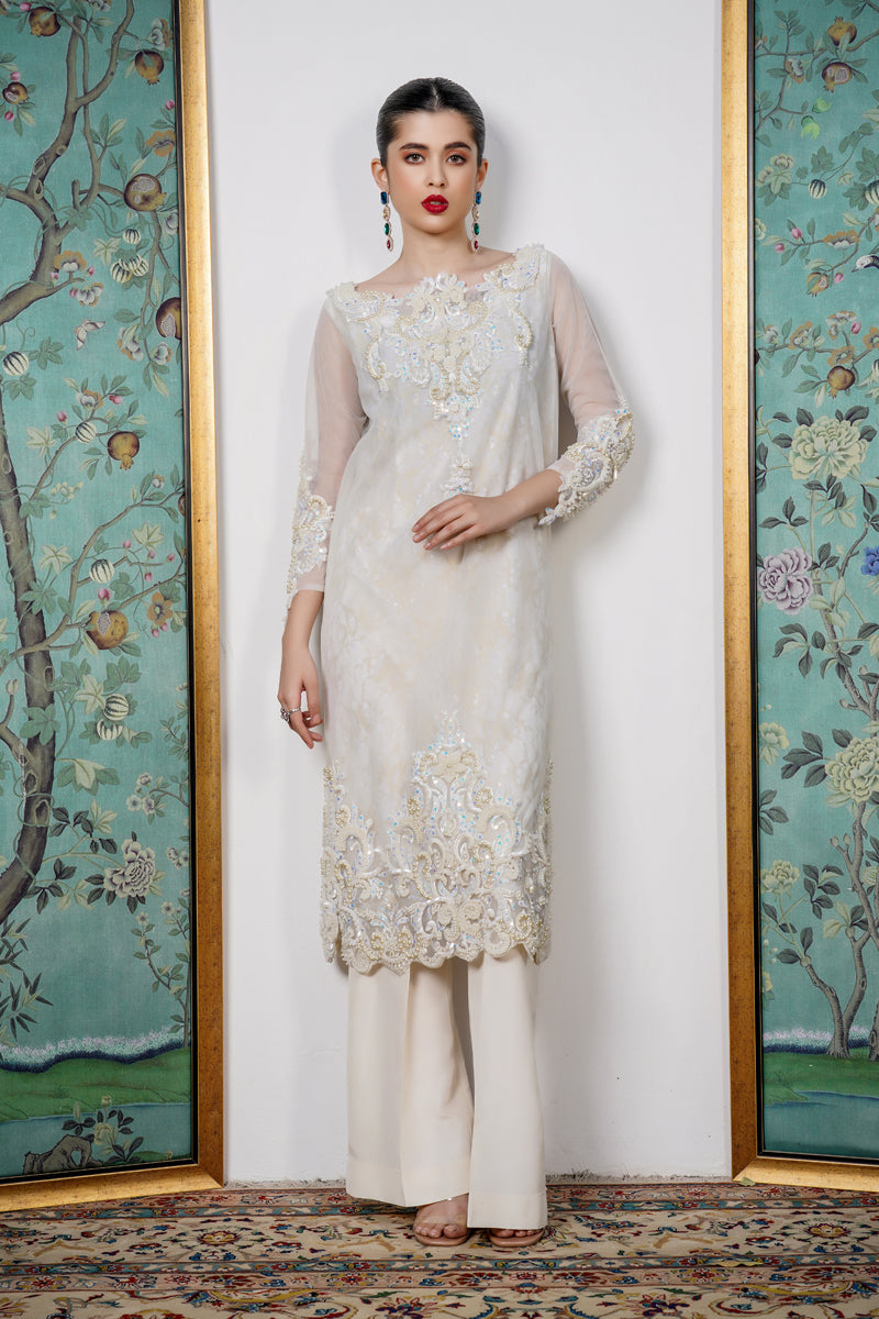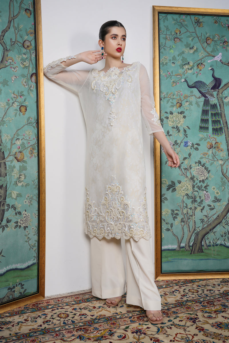 This ensemble features a combination of net and lace fabric, creating a delicate and elegant look. The pants are made of raw silk, providing a contrasting texture to the overall outfit. The work done on this ensemble includes Rashim thread embroidery and the addition of pearls, adding a touch of sophistication and intricacy. The outfit is further enhanced with special sataras, which are decorative motifs or patterns, adding a unique and eye-catching element to the design. Overall, this outfit exudes a graceful and feminine charm.