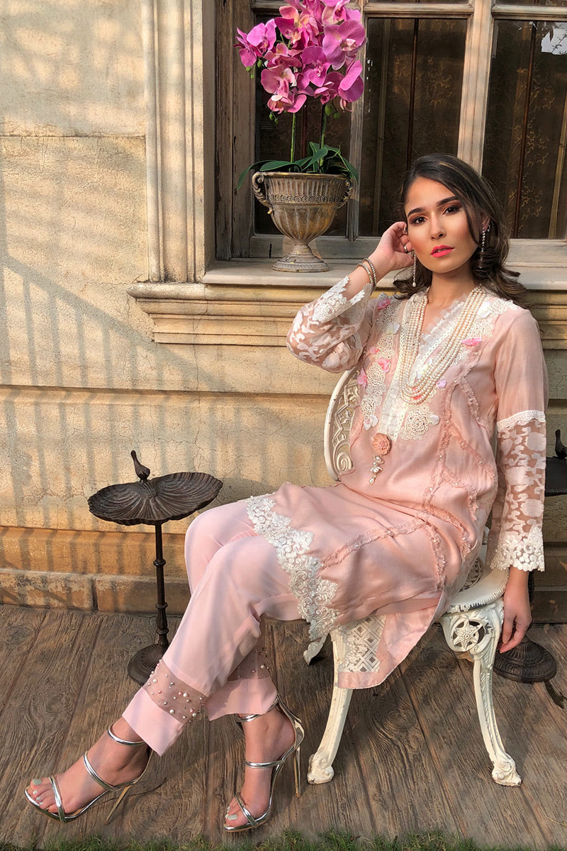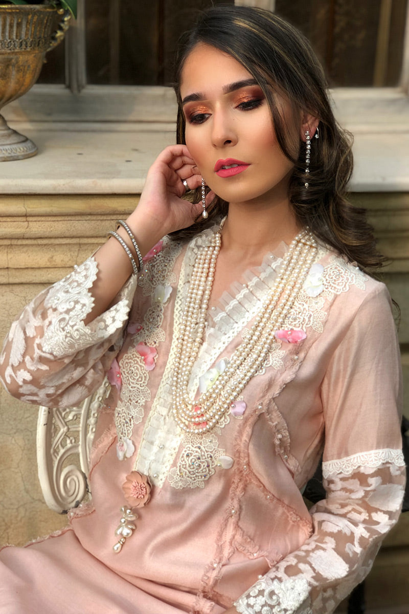 Complementing the pearls embroidered onto it, this pearl-pink shirt emits a gentle grace befitting its floral motif. A must-have for ladies with the finest taste.