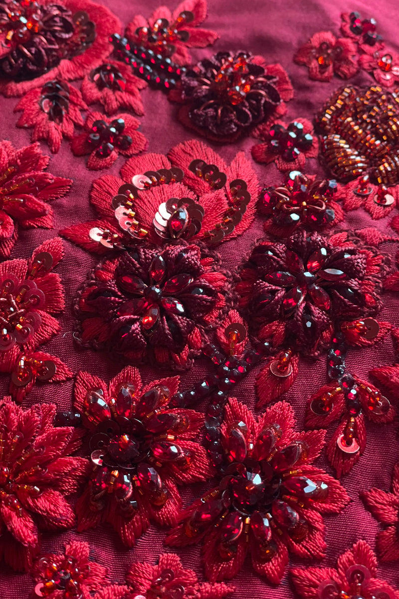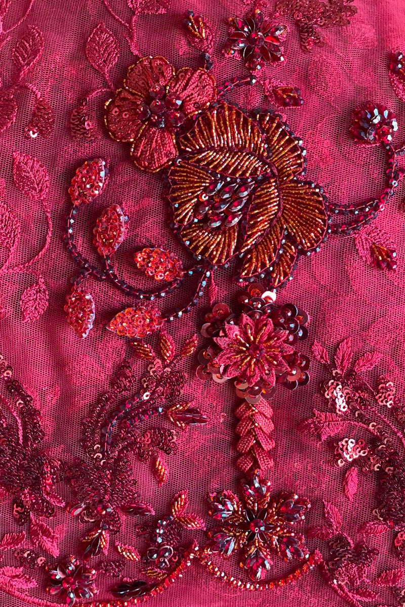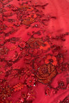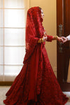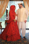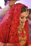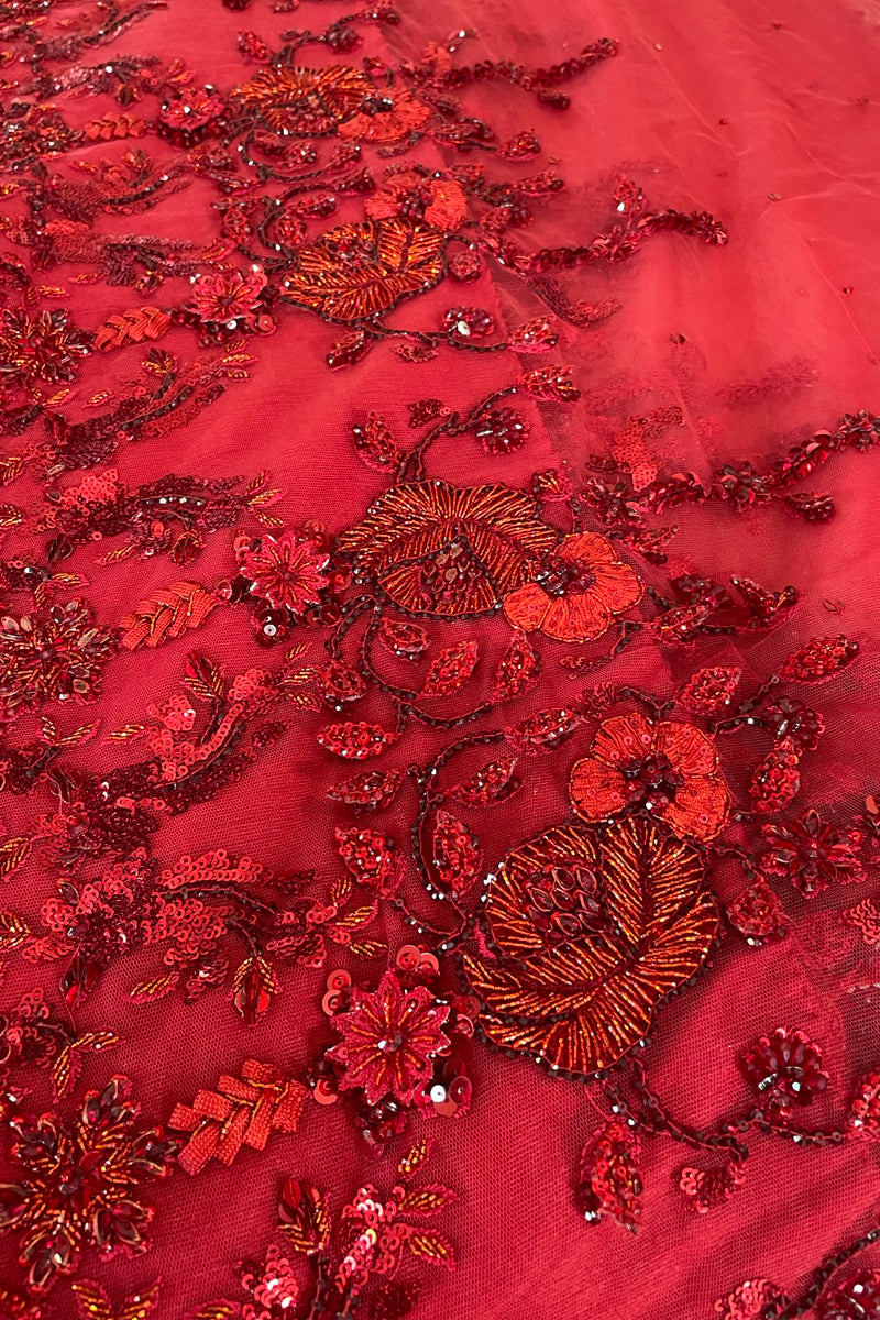 Description: This exquisite bridal ensemble features a stunning red-on-red design, comprising a lehenga, choli, and dupatta. The base fabric is made of net, elegantly lined with raw silk to enhance its luxurious appeal. The entire outfit is lavishly embellished with intricate red Swarovski crystals, delicate threadwork (rashim), fine dabka embroidery, and graceful ribbon accents. The dupatta is adorned with three-dimensional Swarovski crystal flowers that add a touch of elegance. Notably, both the front and back of the bridal attire showcase identical, captivating detailing, ensuring a mesmerizing look from every angle.