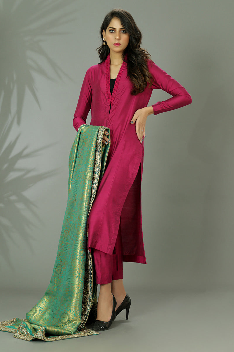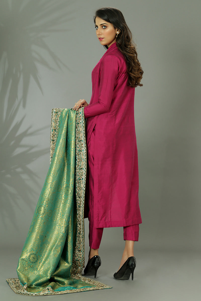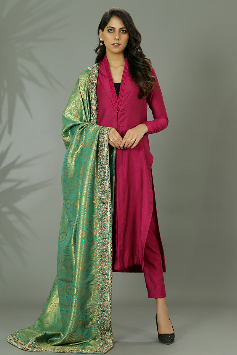 Richly detailed border design on a luscious banarsi shawl combined with a plain cotton net suit will bring glamour and romance to your formal wardrobe.