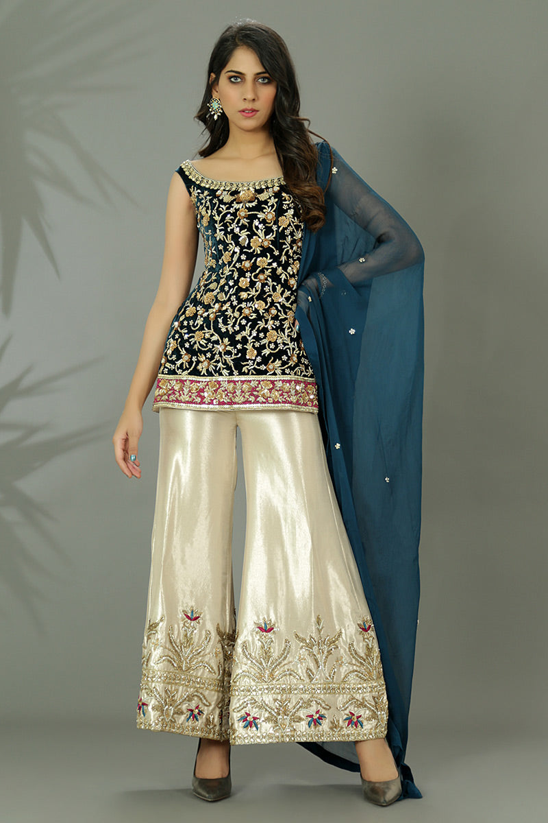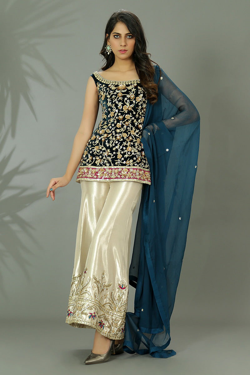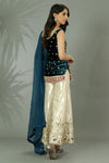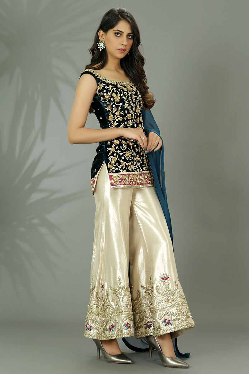 A warm teal jeweled couture piece with an accent of magenta ready to dazzle your wardrobe. Velvet shirt, Tissue pants, Crinkle dupatta 3 Pcs