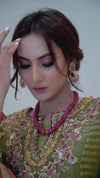 Exquisite shades bejeweled with timeless details and unique designs on the cotton net shirt. Mehndi green long kali kurta worked with very fine details purely handcrafted and embellished with an orange net dupatta. Perfect for your formal and semi formal events.